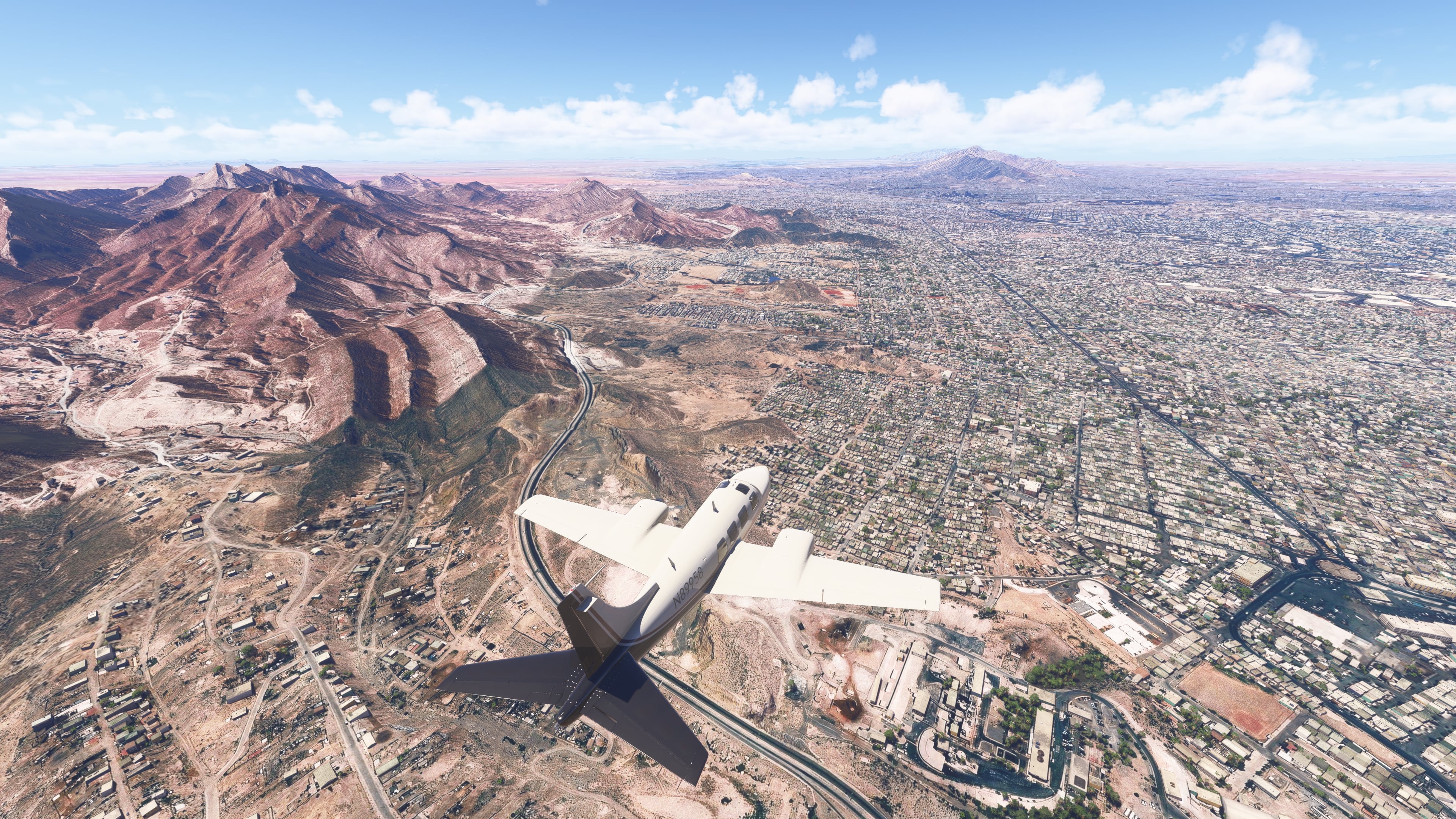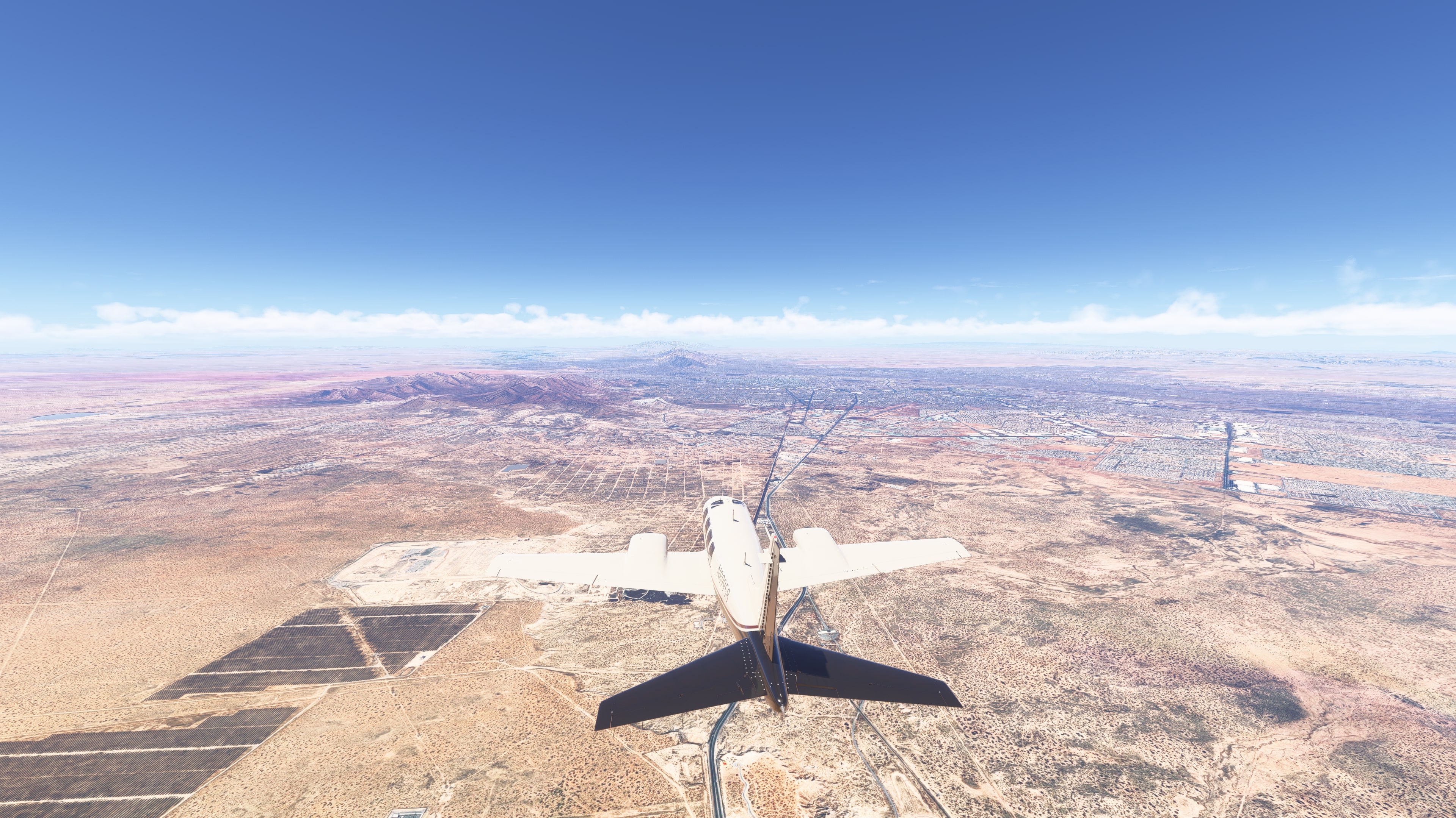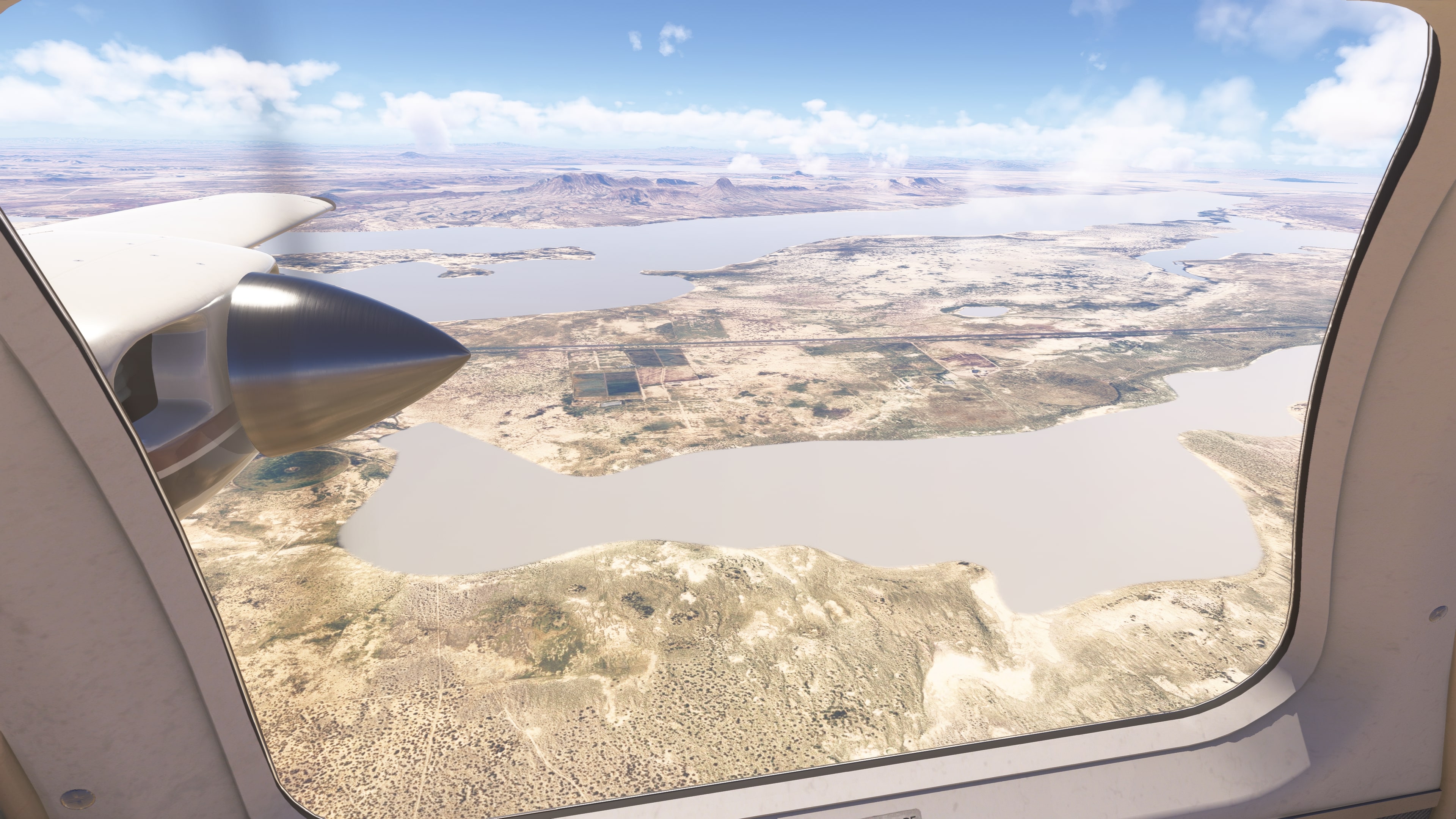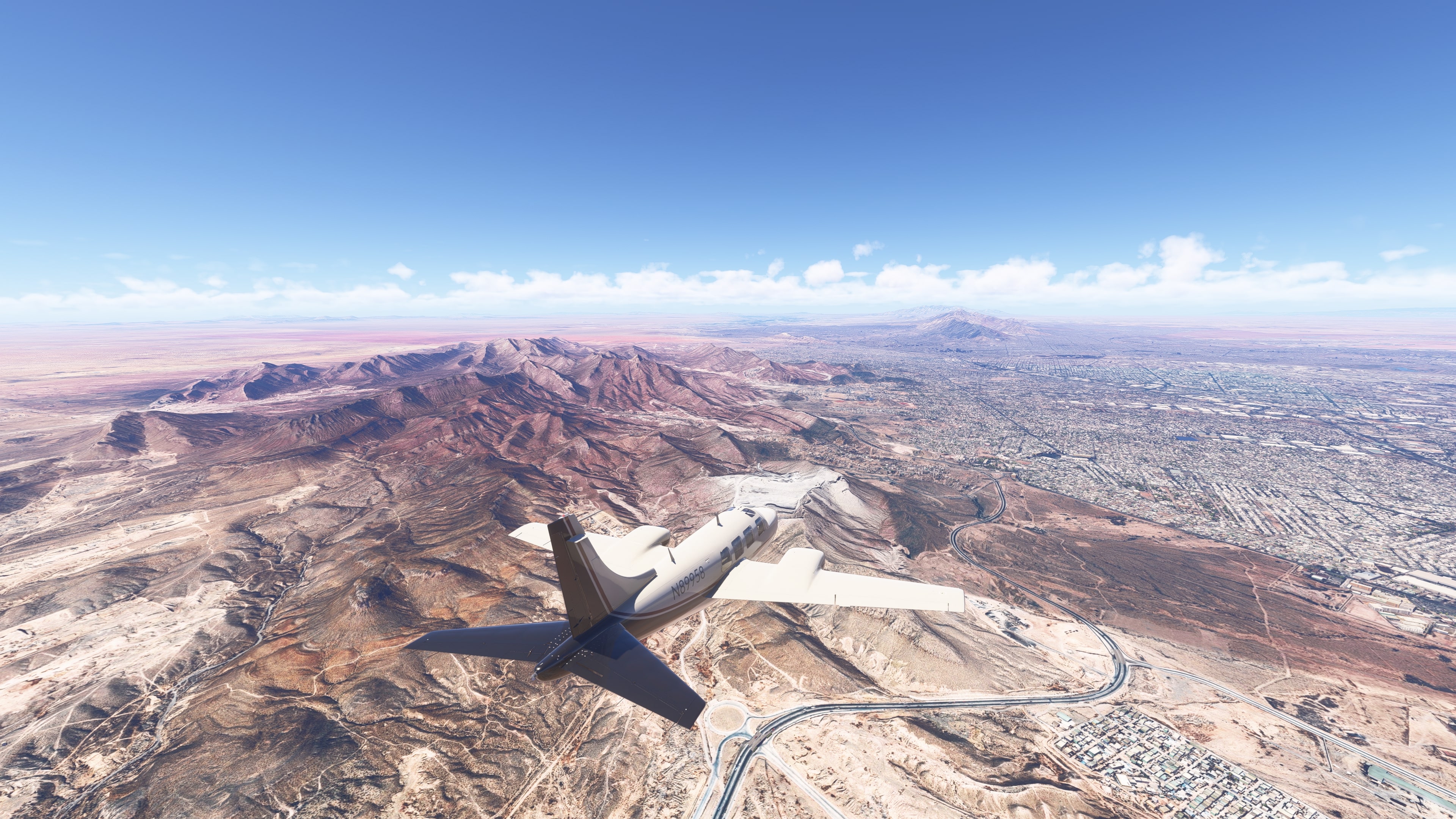 🛫 Start z Chihuahua City (MMCU) – letiště General Roberto Fierro Villalobos leží na okraji města. Krátce po vzletu se otevírá výhled na planiny a kopce severního Mexika. V dálce je vidět pohoří Sierra del Nido a suchá koryta řek.