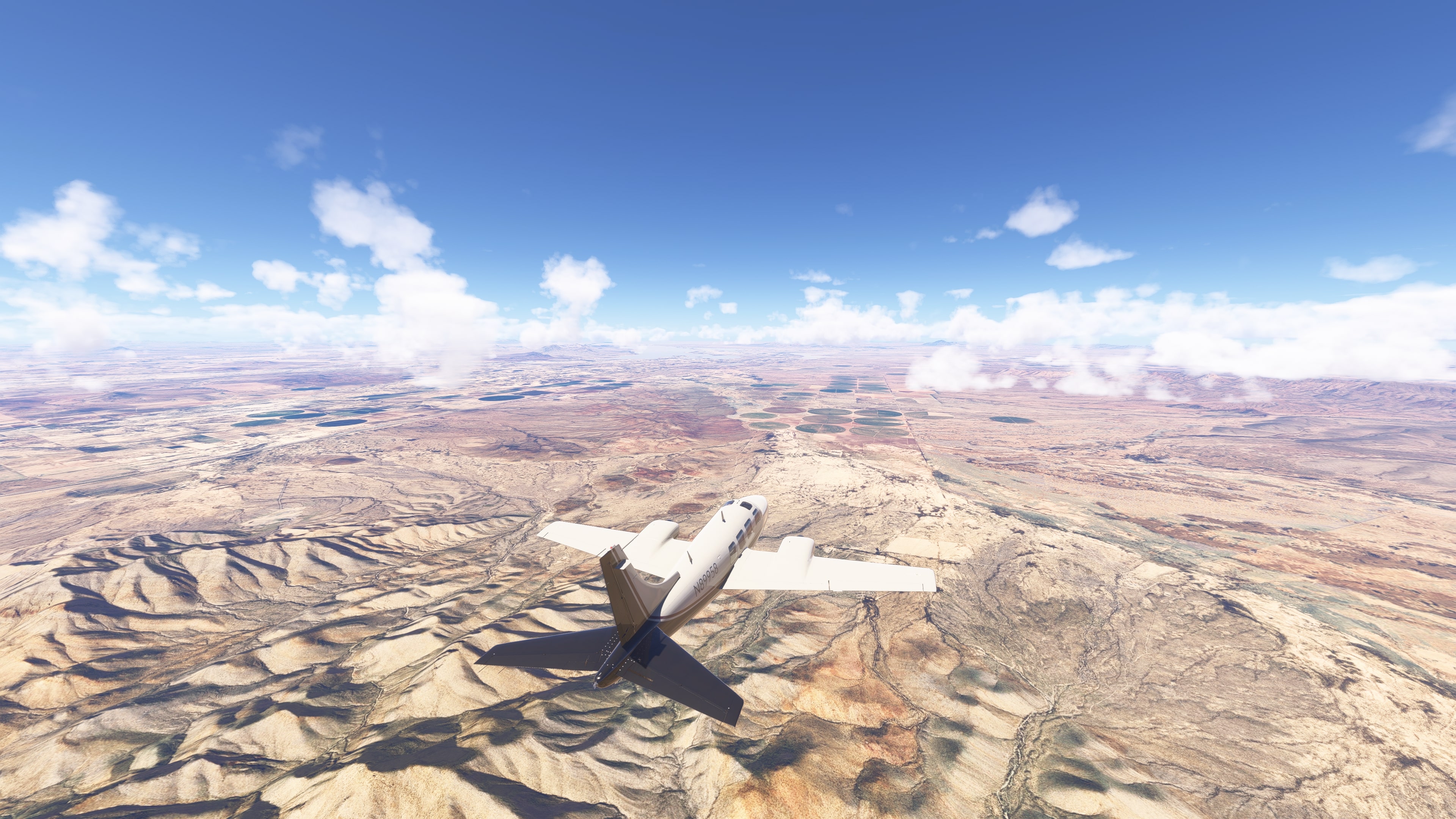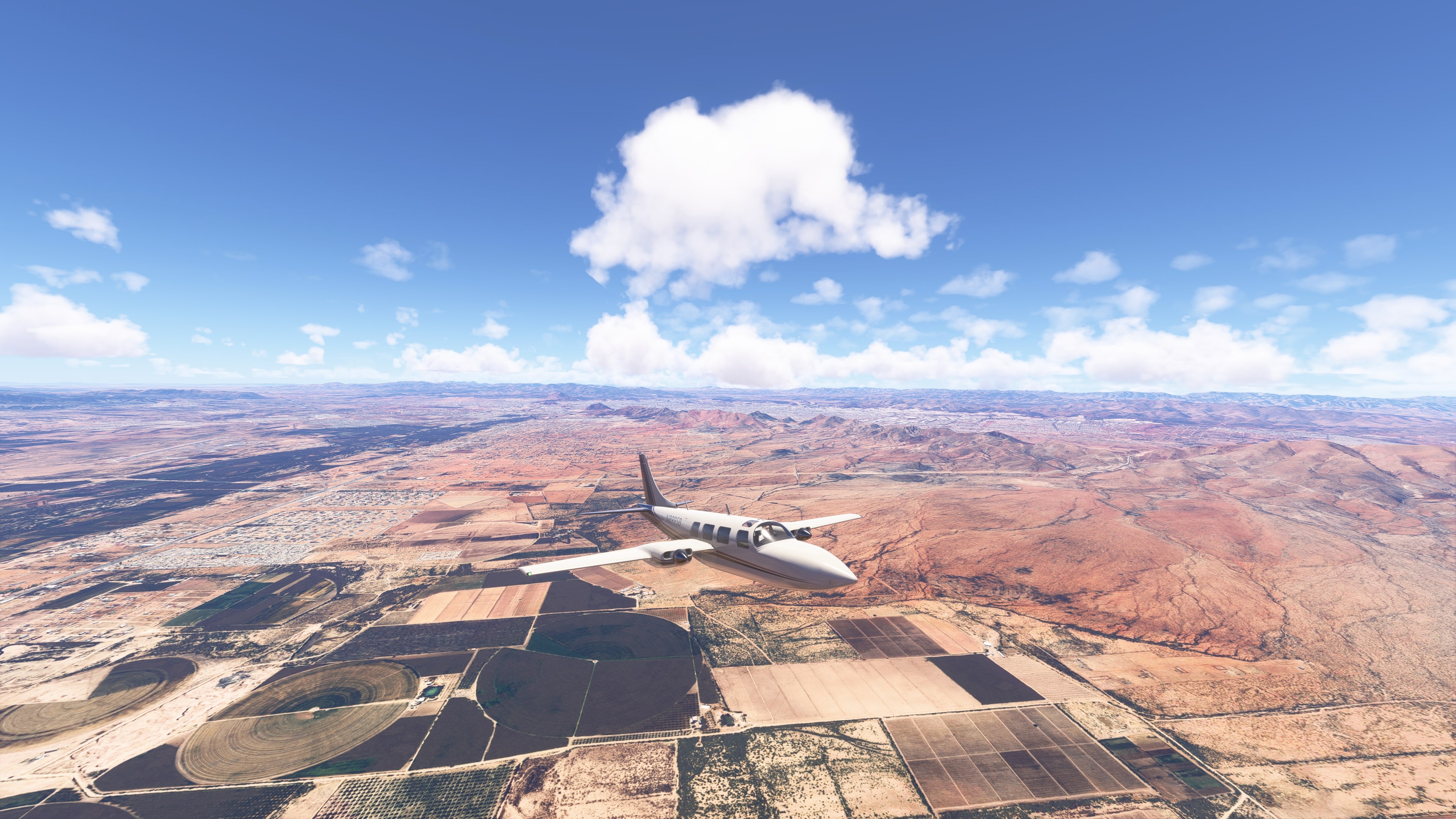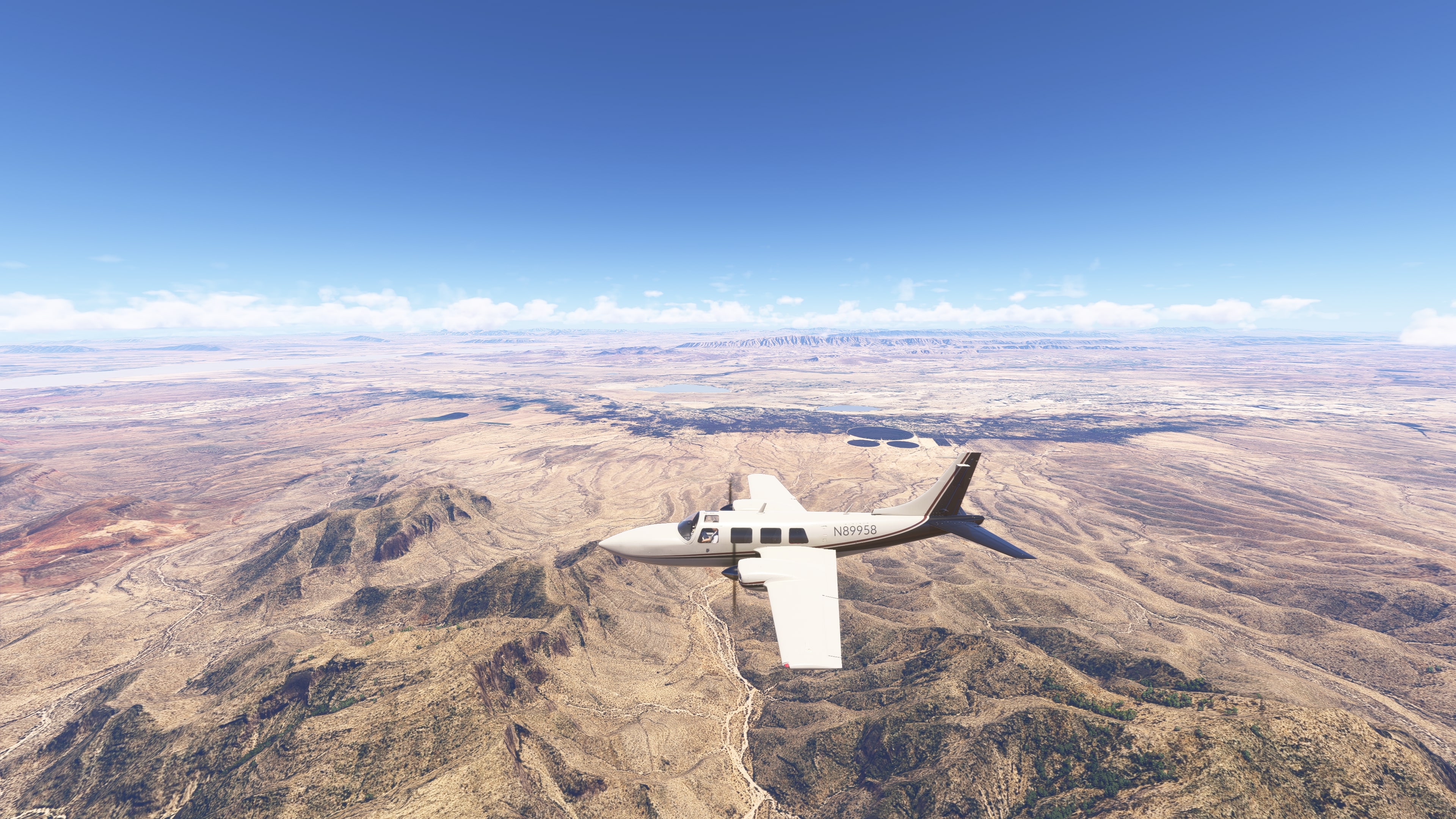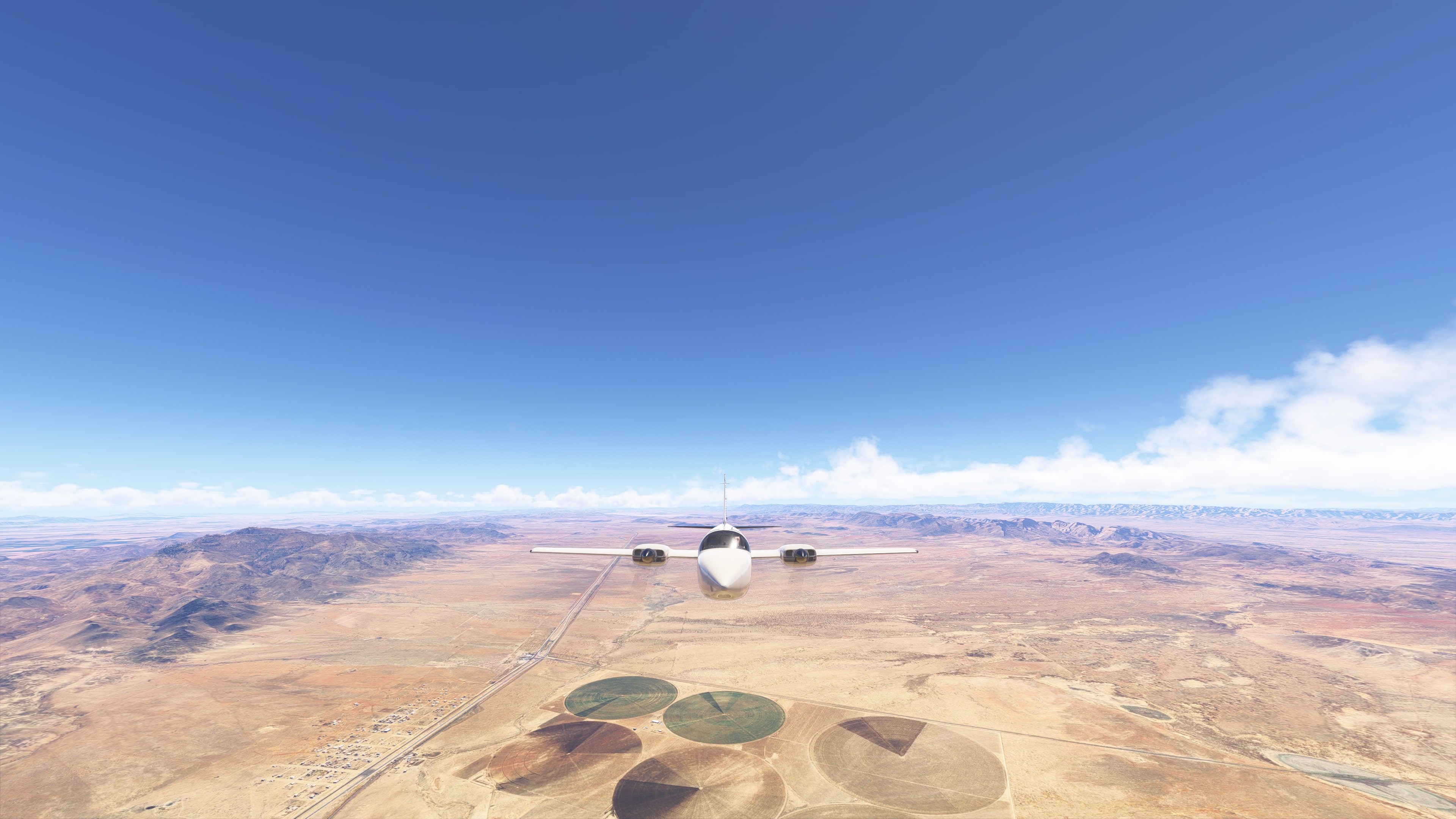 🛫 Start z Chihuahua City (MMCU) – letiště General Roberto Fierro Villalobos leží na okraji města. Krátce po vzletu se otevírá výhled na planiny a kopce severního Mexika. V dálce je vidět pohoří Sierra del Nido a suchá koryta řek.