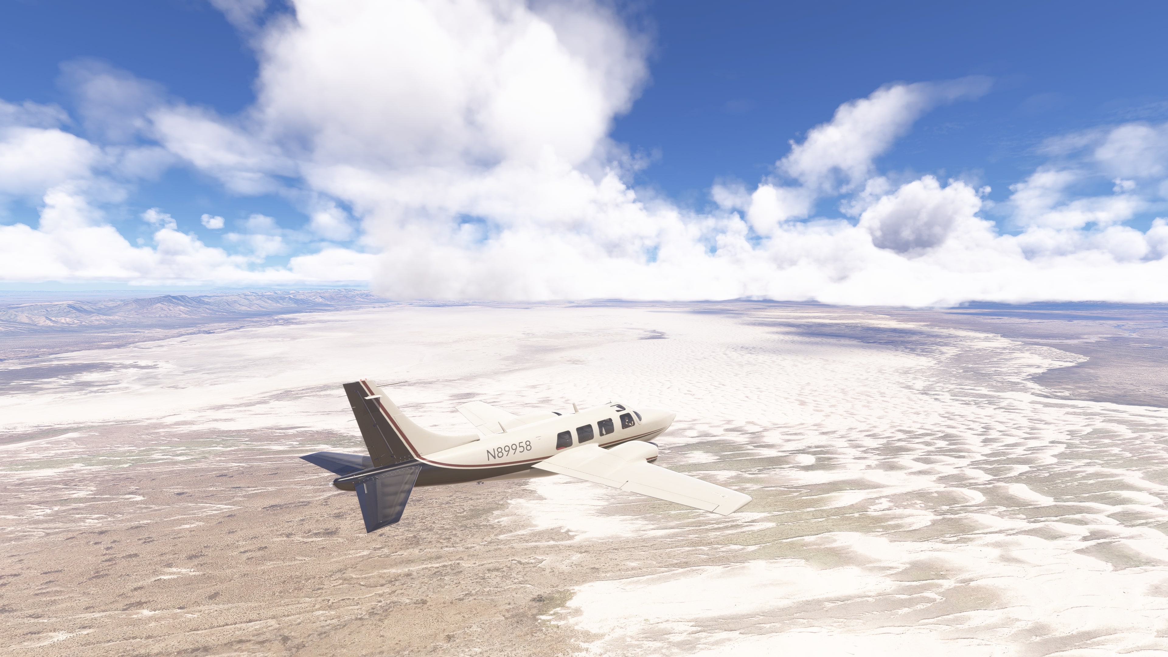 🏜️ White Sands National Park – white dunes contrasting against the surrounding mountains. Bright, shimmering bands with fine structure, often showing visible roads between them.