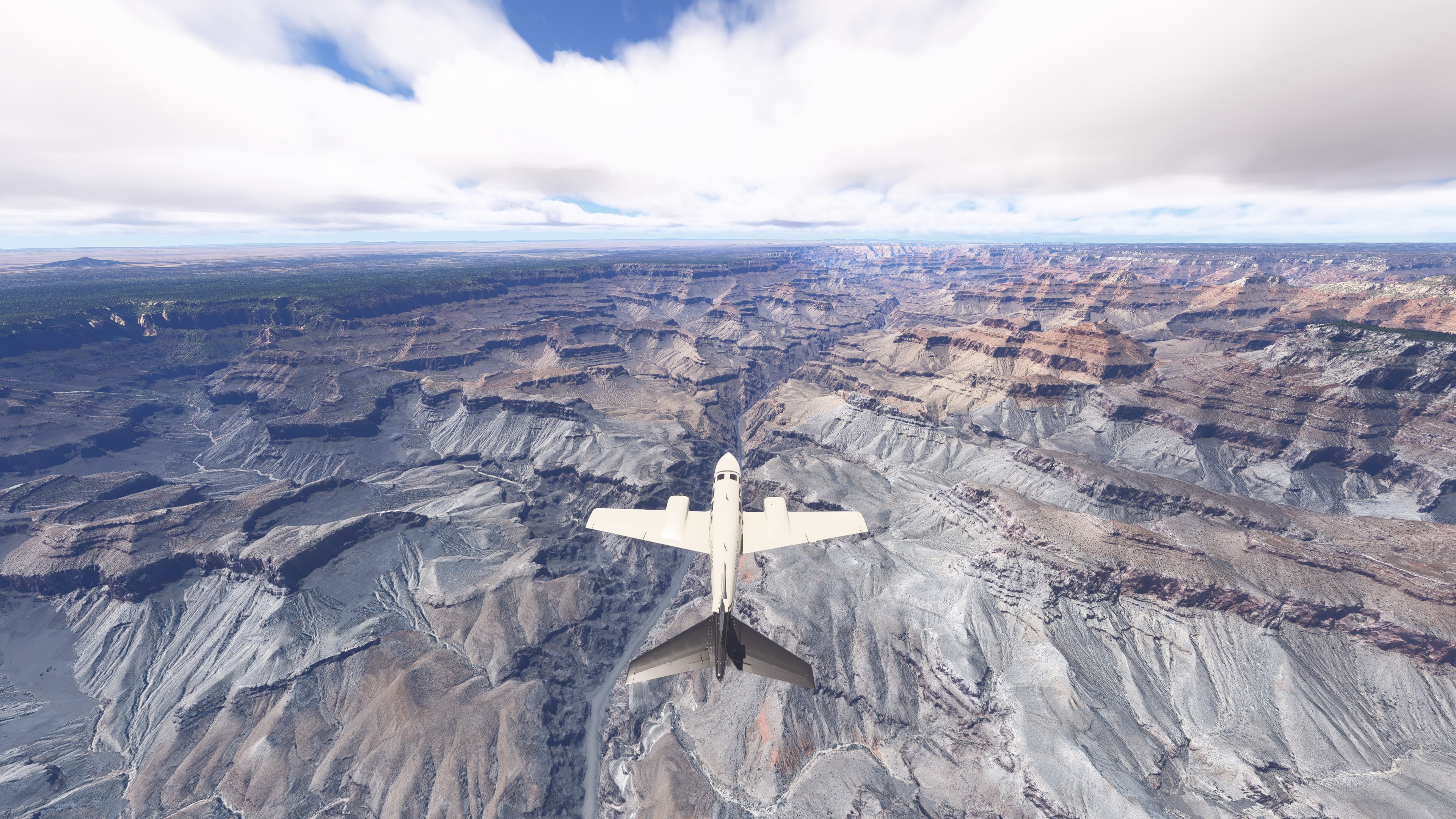 South Rim Approach – approach from the southeast over the main viewpoints of the Grand Canyon. Pronounced stratified rock structures, deep canyons, and visible hiking trails.